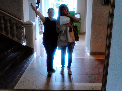 Это мы стоим внизу, в холле ВГИКа, там тишина, я почему-то изображаю веселого Гитлера, а на Сашке (она справа) навешано "море" вещей. Фото Александры Агафоновой. |