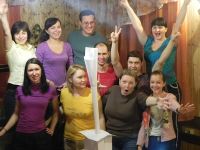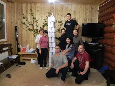 Потом, этой же командой мы делали еще одно общее дело. За 20 минут нужно было собрать башню из листов бумаги, форматом А4. И важно, чтоб она простояла 3 минуты и не рухнула.